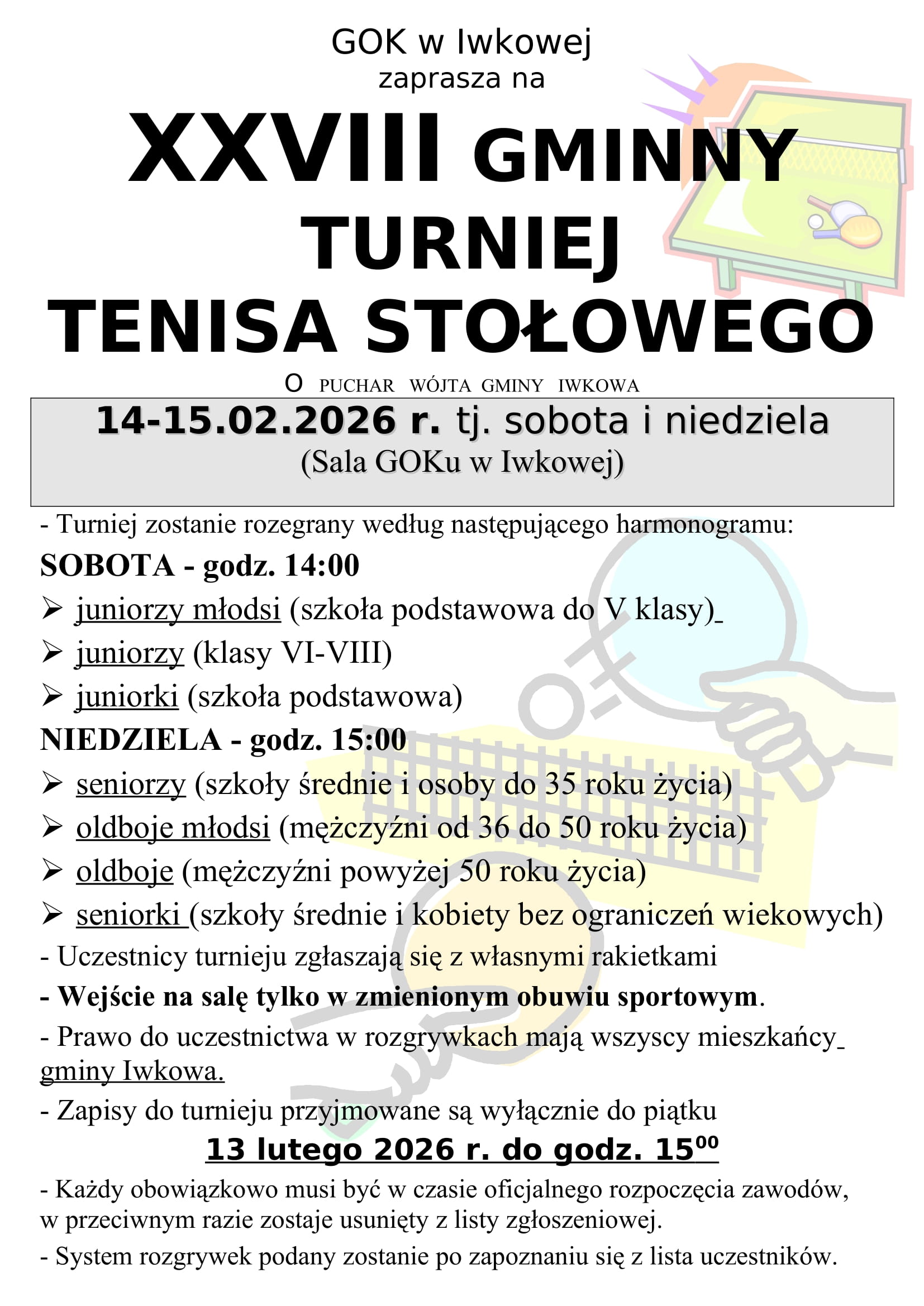 XXVII Gminny Turniej Tenisa Stołowego o Puchar Wójta Gminy Iwkowa rozegrano w dniach 1 i 2.02.2025 r., wzięło w nim udział 55 zawodników (7 juniorek, 8 seniorek, 8 juniorów młodszych, 4 juniorów, 13 seniorów, 8 oldbojów młodszych i 7 oldbojów).