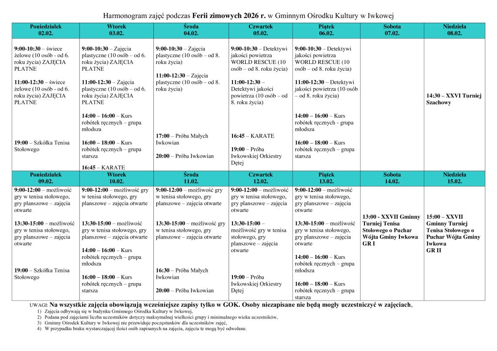 Ferie Zimowe 2025 w GOK Iwkowa to warsztaty plastyczne, nauka pierwszej pomocy, treningi KARATE i AIKIDO oraz turnieje szachowe i tenisa stołowego. Warsztaty cieszyły się sporym zainteresowaniem zaangażowanych uczestników. Dziękujemy za liczny udział i zapraszamy na kolejne wydarzenia!