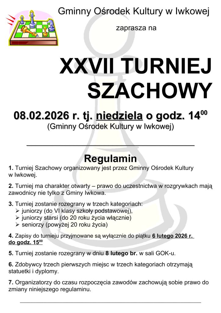 W niedzielę 26 stycznia odbył się XXVI Turniej Szachowy w naszej gminie. Po zaciętej rywalizacji i dogrywce w najmłodszej kategorii udało się wyłonić zwycięzców. Wszystkim uczestnikom dziękujemy za udział. Zapraszamy wszystkich chętnych do wypróbowania swoich umiejętności w turnieju w przyszłym roku.